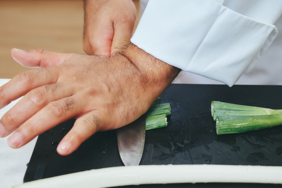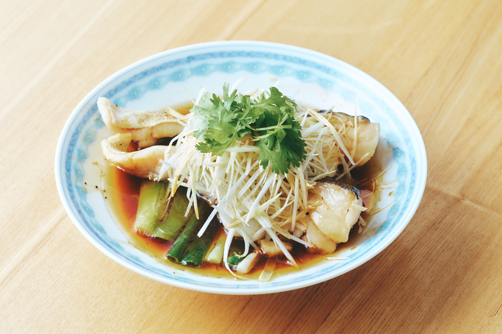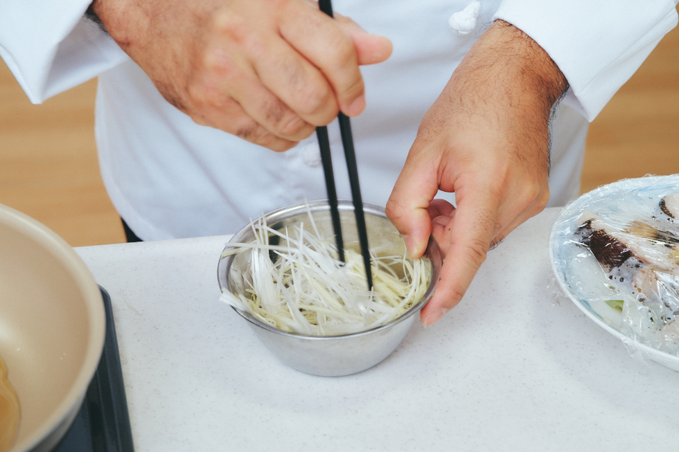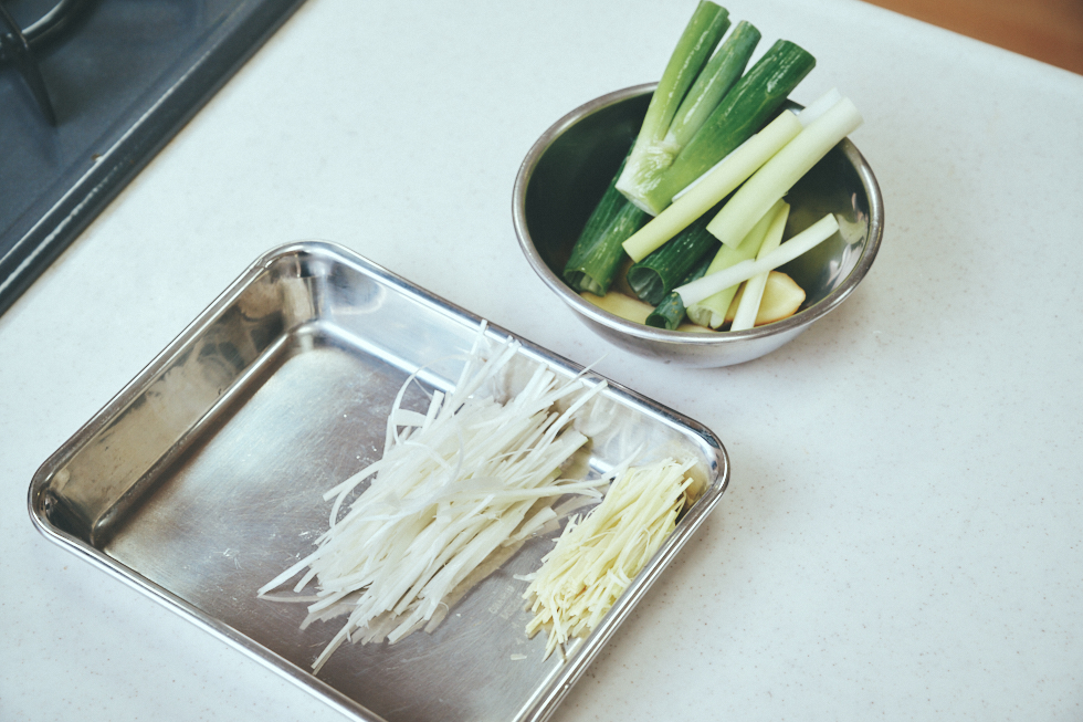 長ねぎとしょうがは、たらと一緒に蒸すものと仕上げにのせるものの2種類。仕上げ用は千切り、蒸す用は千切りで使わなかった部分を余さず活用します。