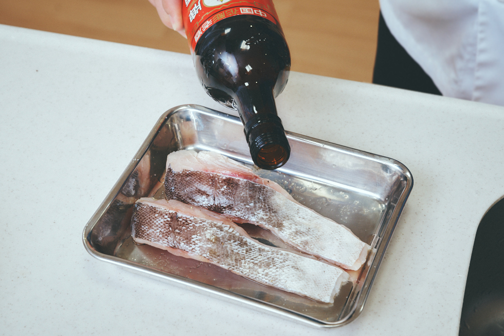 川﨑さん「下味をつけるのは、魚とたれの味のバランスを取り、一体感を出すためです。酒はご家庭にあるものでよいですが、オススメは紹興酒。特に中華料理は、香りよく、味に深みが出て、より本格的な味わいになります」