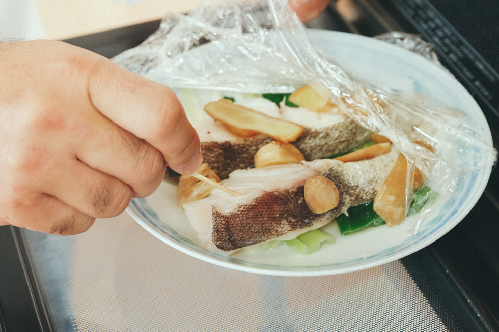 川﨑さん「ラップはふんわりとかけるのがポイントです。これは加熱中の蒸気の力でラップがさけたり、電子レンジから取り出した際の温度変化でラップが縮んで魚の身がつぶれたりしないようにするためです」