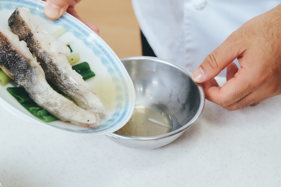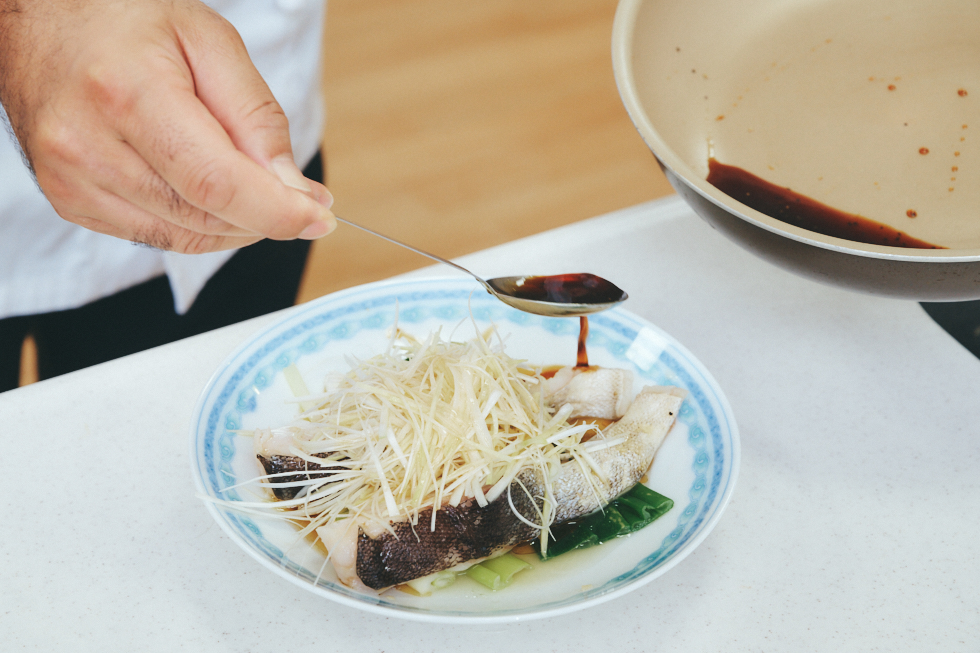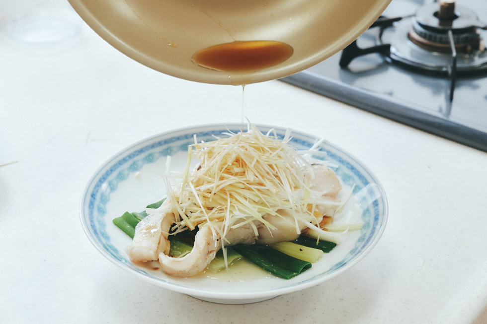 川﨑さん「魚の皮は脂質が多く、酸化するとにおいが出やすいんです。そこでごま油をかけて、においをマスキングします。長ねぎとしょうがは熱い油がかかることで火が通って、食べやすいやわらかさになりますし、香りもよくなります」