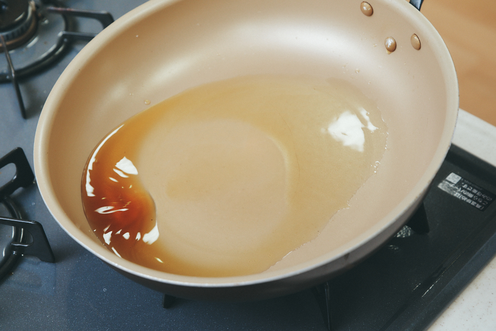 ごま油は、トロっとした状態からサラサラになるまで加熱したら、熱いうちにたらの皮、長ねぎ、しょうがにかかるように回しかけます(油はねには注意)。
