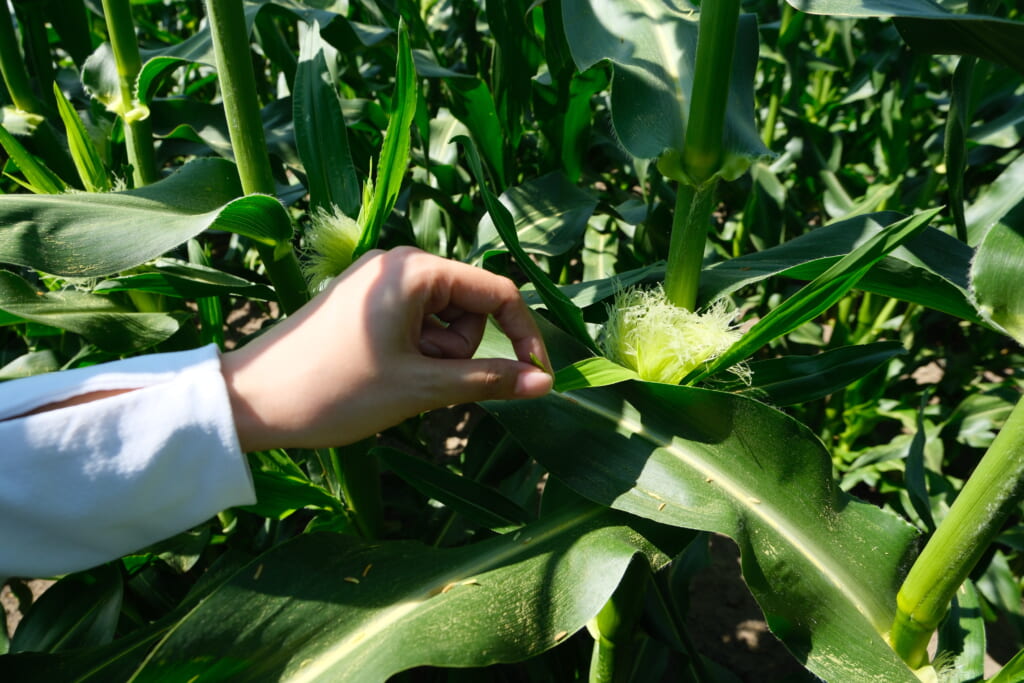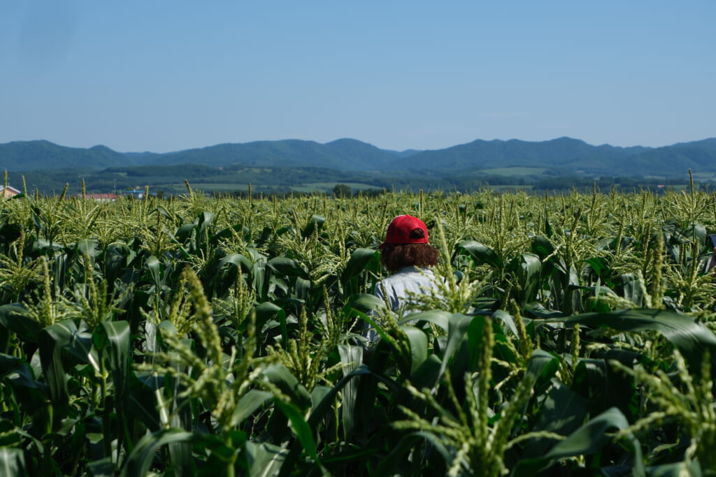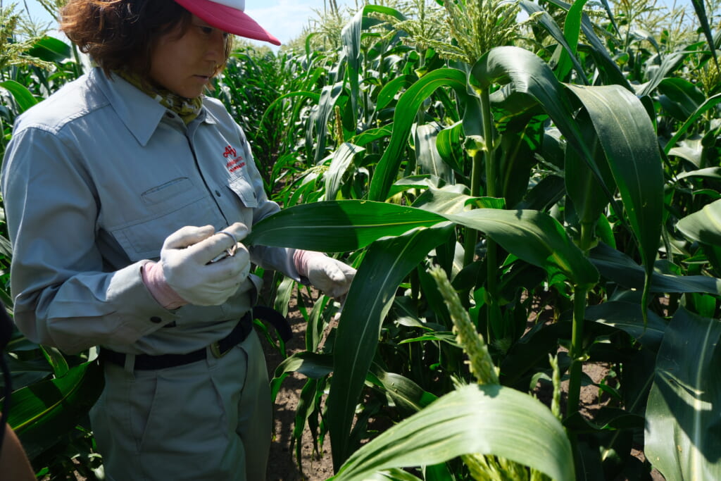和賀さん「春から収穫までのシーズンは生育状況の確認が主な仕事ですね。5月上旬に雪解けをした土地に種を植え、まいた種の半分くらいが発芽してきた頃から生育調査をはじめます。7月末頃には、実になる部分の先端に、絹糸(きんし)が出ているかどうかを確認しています。いわゆるとうもろこしの『ひげ』と呼ばれるものですね。糸の出始めは受粉開始の合図。ここから実が大きくなり始めるサインなんです。この日を基準に、より正確な収穫日を予測していきます」