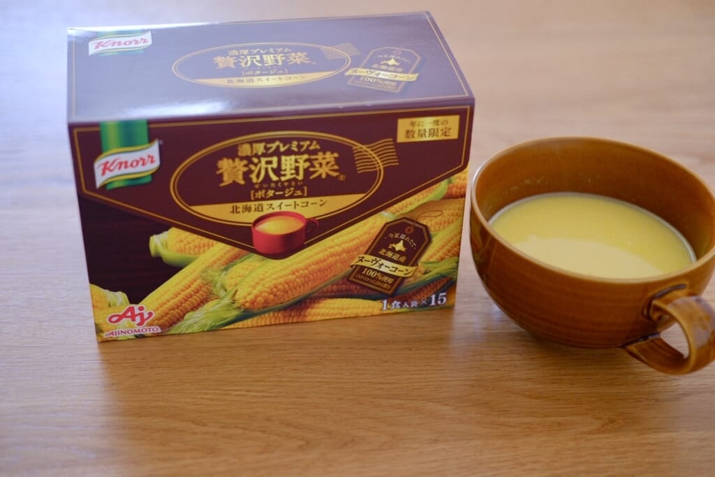 ただ今予約受付中の「クノール®贅沢野菜®」〈北海道スイートコーン 今夏採れたてヌーヴォーコーン〉。この夏に採れたスーパースイートコーンだけを収穫から24時間以内にパウダー化した、数量限定の濃厚ポタージュスープです。