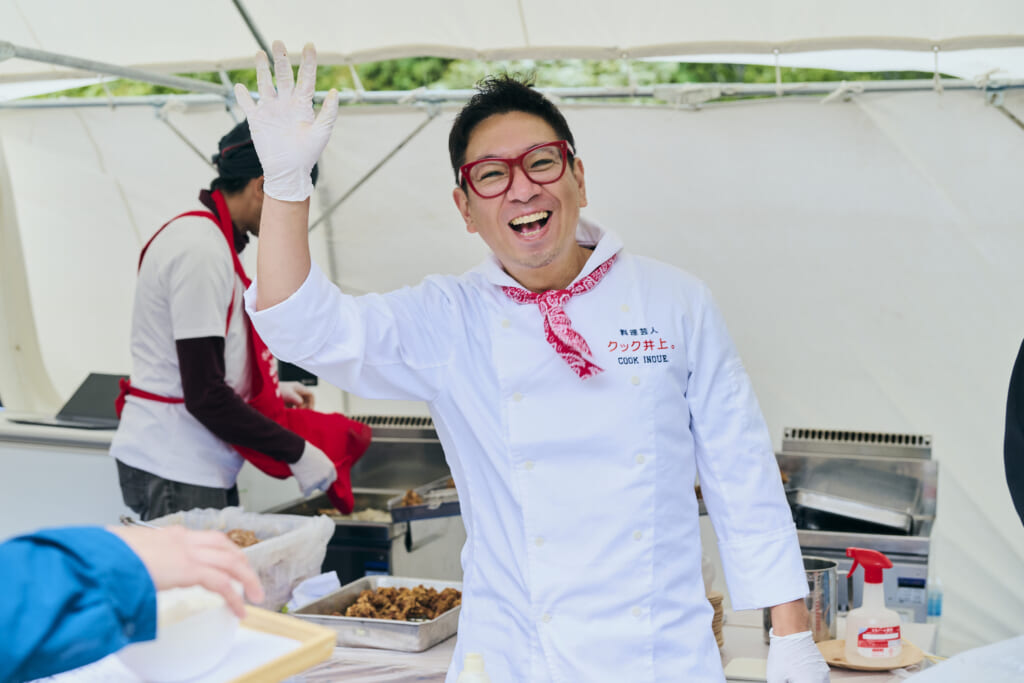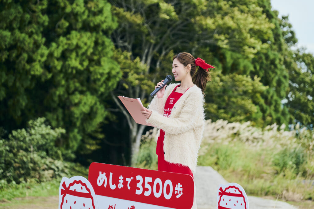 程よい疲れと空腹が、まさに最高のスパイス! 想像以上の達成感に包まれたゴールとなりました。ここでは、大きなしゃもじを手に記念撮影。100人目、200人目などキリの良い来店者には、味の素のコーポレートキャラクター「アジパンダ®」グッズのプレゼントもありました。
