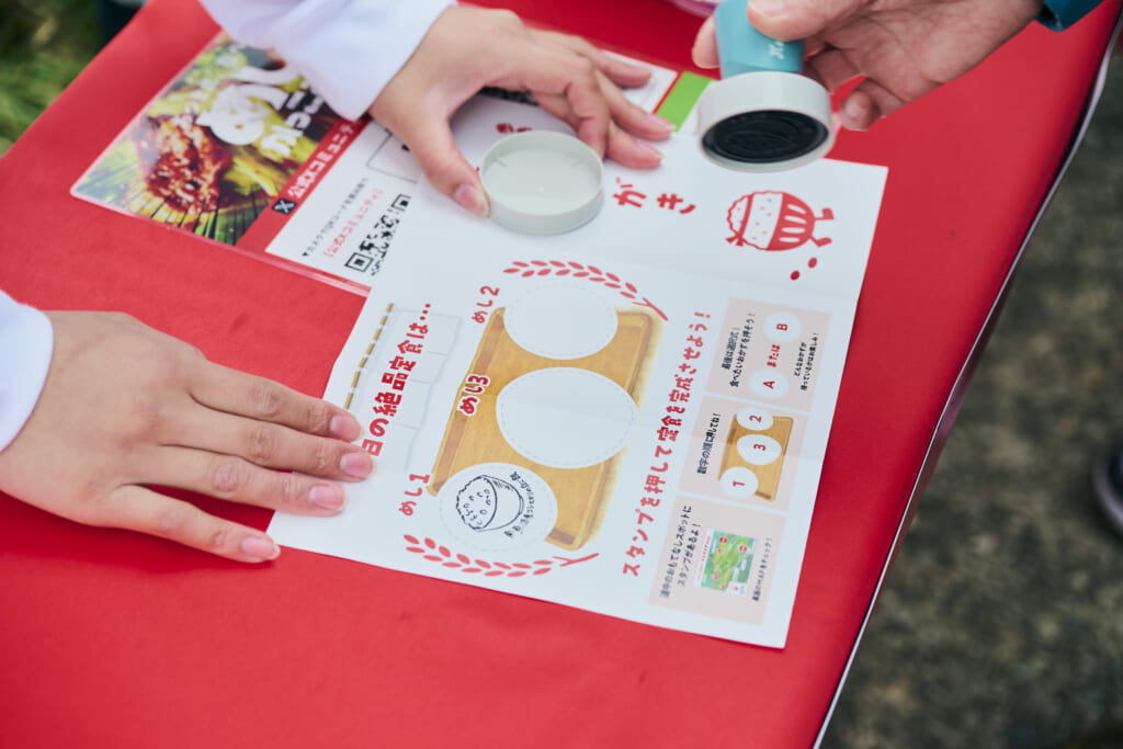 「今日のご飯なんでしょうね?」と周りの方とおしゃべりしているうちに、最初のおもてなしスポットに到着しました。笑顔の店員さんから「お疲れさまです! スタンプをどうぞ〜!」と手渡されて、ポンッ!