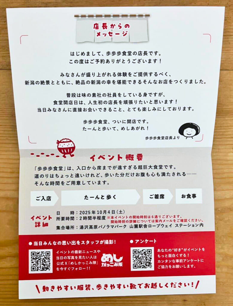 開けてみると、店長からのメッセージとイベント概要が。なるほど、歩いた分だけお腹も心も満たされると。それならば、たーんと歩いてみせようじゃありませんか! でも、肝心のお食事は「絶品の新潟の幸」としか書かれていません。いったい、何が味わえるのでしょう…?