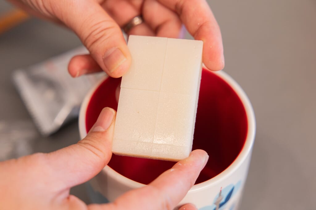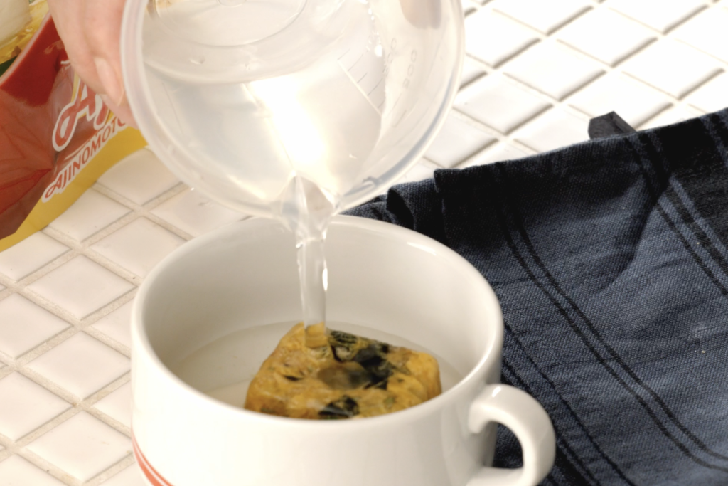 作り方はとっても簡単。まず、餅と乾燥スープを袋から取り出し、中身を深めのお皿(大きめのマグカップ等)に入れます。