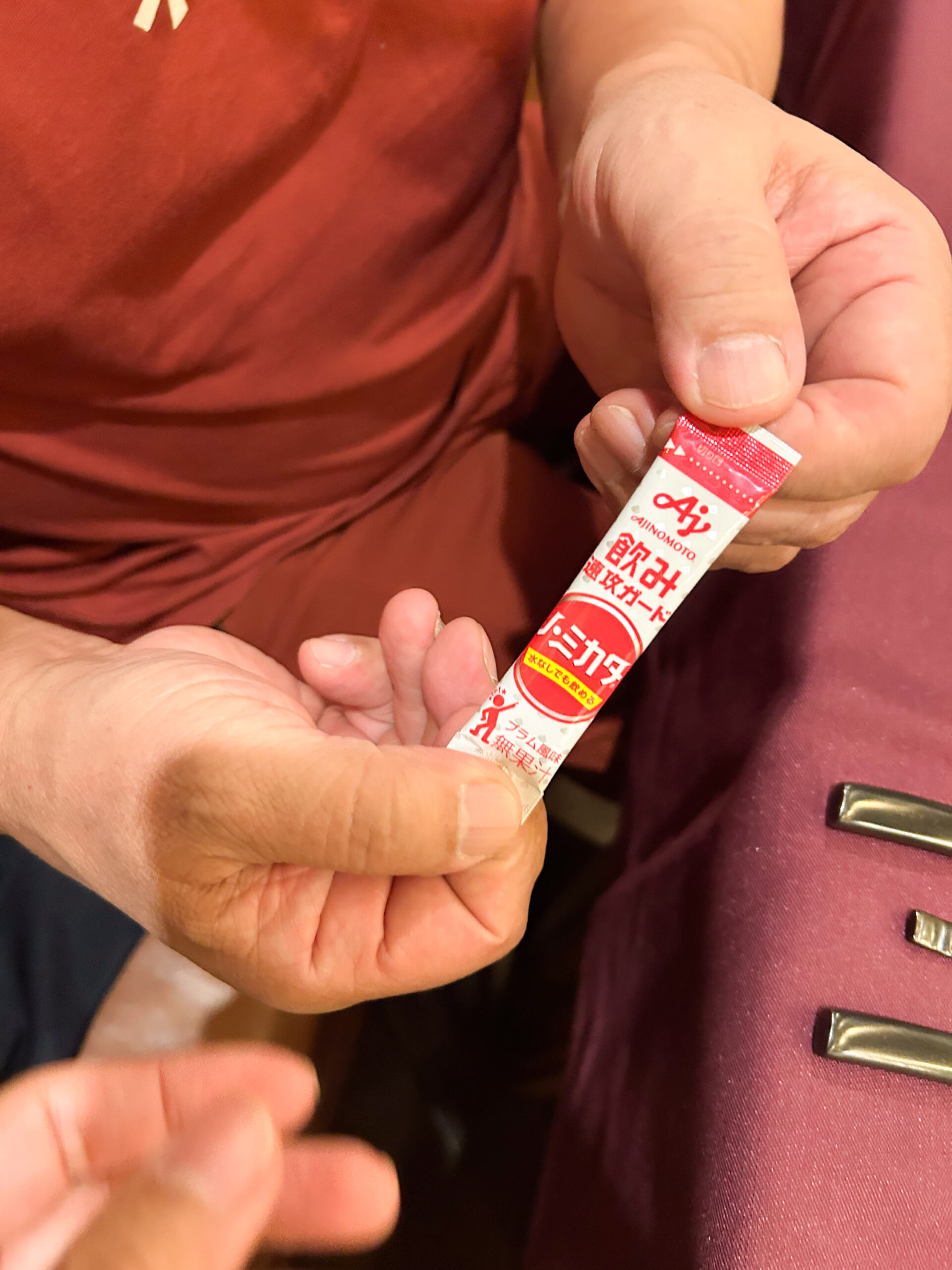 そんな時、木本さんがよく持って行くのが「ノ・ミカタ®」サプリメント。スティック型の個包装1本に、しじみ160粒相当分のアミノ酸(アラニン)が入ったもので、食事会がはじまる前に友人たちに配るのだそう。