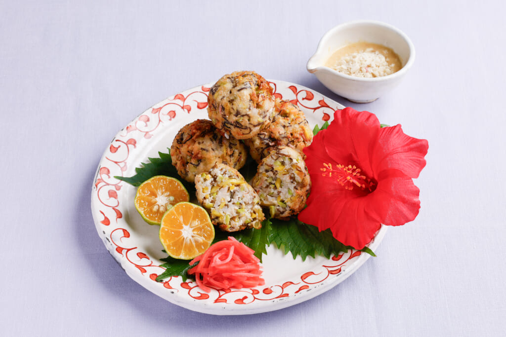 車えび、島豆腐、もずく、シークワーサーをはじめとする沖縄県産食材に、さらなる栄養価を高めるため、祖父が暮らす千葉の名産品である落花生と枝豆をミックス。多品目の食材をバランスよくまとめた一品は、ふんわりと揚げた生地の中に食感のアクセントが楽しく、白みそベースのソースをつけることでより豊かな風味を感じる味わいです。