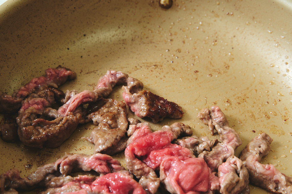 3. 深めのフライパンにサラダ油を入れ、牛肉を広げて加え、砂糖をふってなじませる。中火にかけて炒め、肉の片面に焼き目をしっかりつける。