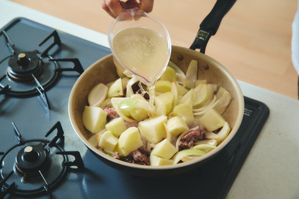 肉に焼き目がついたら、加熱したじゃがいもと切った玉ねぎを加え、だし・しょうゆ・みりんを加えます。