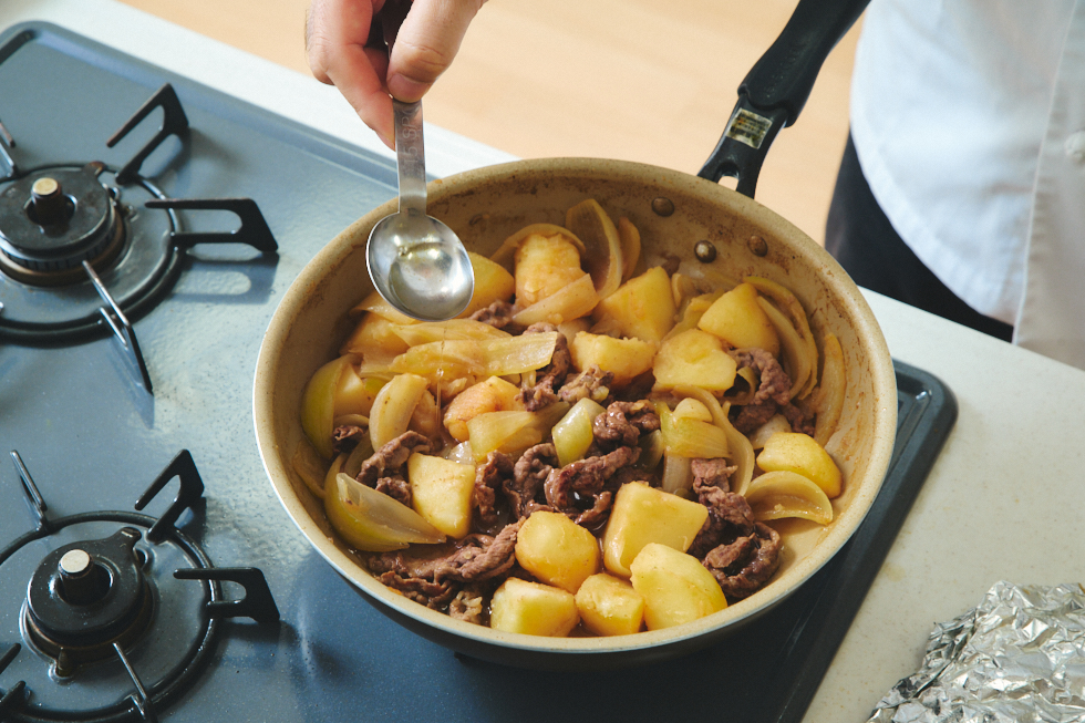 フライパンひとつで、コツを押さえれば失敗なくおいしく作れる肉じゃが。ぜひみなさんも試してみてくださいね。