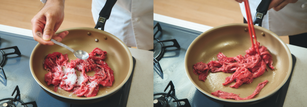 この工程は火をつける前に行います。加熱後だと肉の表面が焼けて固まってしまい、砂糖が入りこみづらくなるためです」
