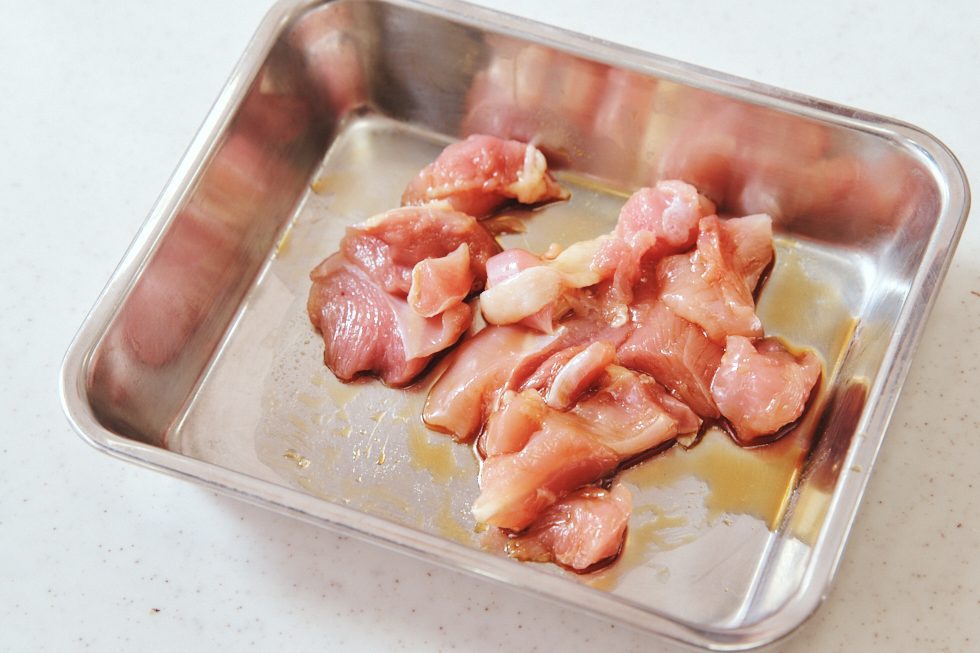 2. 鶏肉はそぎ切りにし、こい口しょうゆを加えてもみ込む。