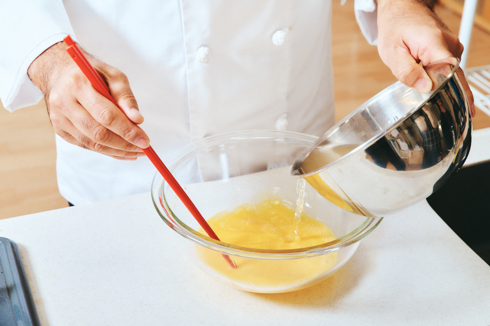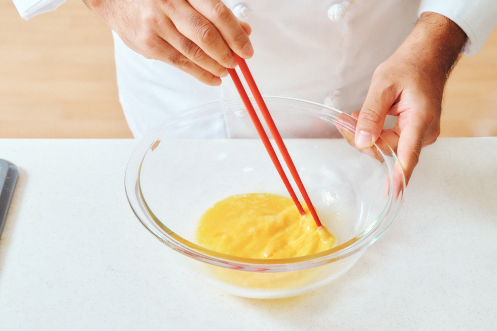 川﨑さん「卵を泡立ててしまうと空気が入り、加熱したときにその気泡が膨張して、スの原因になります。箸をボウルの底につけたまま、空気が入らないようにジグザクと静かに動かしましょう。 また、卵白は卵黄に比べて先に固まる性質があります。そのため、ほぐれていない部分があると、そこだけが先に固まり、食感のムラやスにつながります」