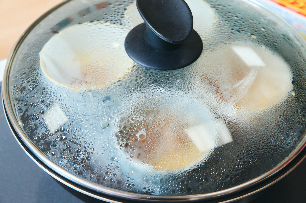 フライパンに蓋をして中火にかけ、沸騰したら弱火に落として10分ほど加熱します。沸騰したまま高温で加熱し続けるとスが入り、ザラついた食感になるためです。