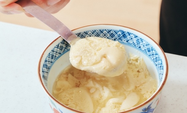 スプーンですくって中を確かめてみると、こちらもスは見当たりません。まずはひと口。ぷるんとした食感とともに卵の甘みが広がります。川﨑さんに教わった通り、混ぜながら崩し、飲むように味わってみるとだしの風味がより一層感じられます。喉越しもよく、スルスルといただけました。