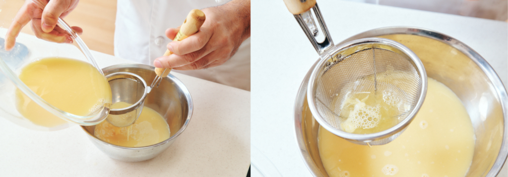 川﨑さん「卵白の粘性、だしに残る細かな固形物、気泡などが残ったまま加熱をすると、スができやすく、火の通り方にも差が出てきれいに固まりません。こすことでこれらを取り除けます。 こす際は、数回に分けて少量ずつにしましょう。一度にやろうとすると目が詰まりやすく、うまくこせなくなるためです」