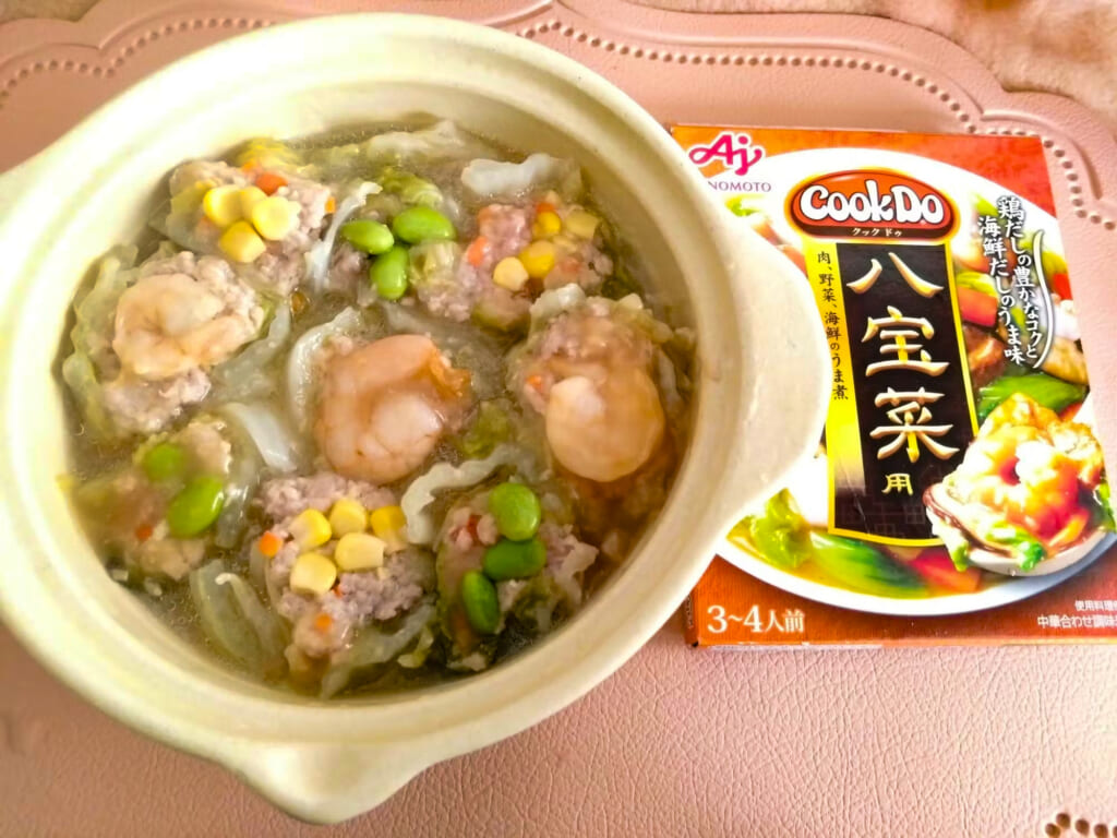 「Cook Do®」<八宝菜用>を鍋のスープに使った、白菜ロール鍋アレンジ。肉だねはすりおろした長いもを加えてふんわり仕上げ、茹でた白菜で巻いてロール白菜に。えびやコーン、枝豆を加えると鍋全体に海鮮と野菜のうま味が広がり、彩りも華やかに。とろみのある八宝菜のたれが具材にしみ込み、最後は雑炊のシメまで楽しめる、寒い冬にぴったりのアレンジです。