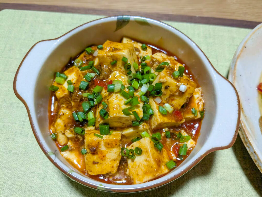 「Cook Do®」<四川式麻婆豆腐用>で使う長ネギを、青ネギに置き換えて豆腐の上にパラパラと散らしたアレンジ。青ネギならではの爽やかな香りが、ピリッとした四川式の辛さにほどよいアクセントを加えます。濃厚なソースをごはんに絡めて楽しむ“麻婆ライス”も絶品。あとを引く辛さがクセになる、満足感たっぷりのひと皿です。