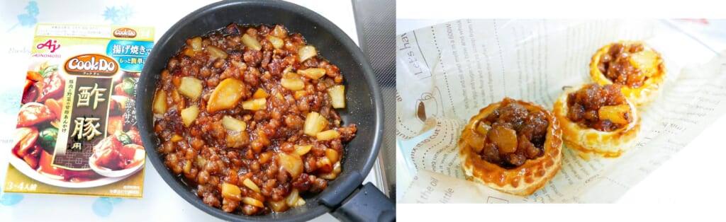 「Cook Do®」<酢豚用>をスイーツに使った、驚きのアップルミートパイアレンジ。甘酸っぱい<酢豚用>のたれはりんごやパイナップルなどの果物とも相性がよく、ひき肉と合わせてパイ生地で包んで焼くと、クセになる甘じょっぱさの“中華風ミートパイ”が楽しめます。残った具材をトーストにのせるなど、自由なアレンジもさらに広がるレシピです。
