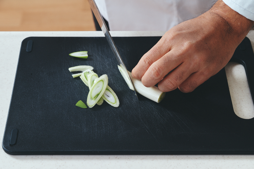 ねぎは程よい歯応えが残るように、5㎜厚さの斜めうす切りにします。