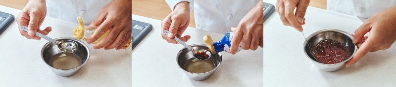 最後に煮汁を作れば、準備完了です。だし汁(水70mlと「ほんだし®︎」小さじ1/4を混ぜ合わせたもの)、しょうゆ30ml、みりん50mlを合わせ、よく混ぜておきます。