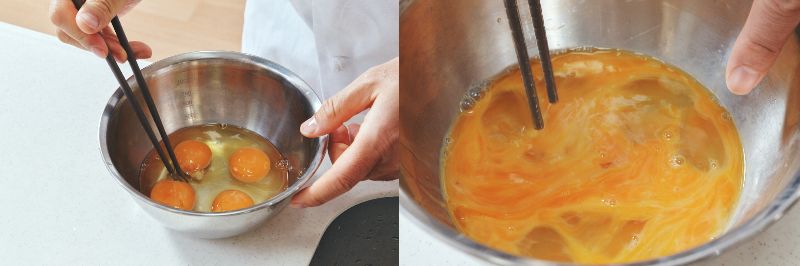 まず、卵を溶きほぐします。ここでのコツは、「混ぜすぎないこと」です。
