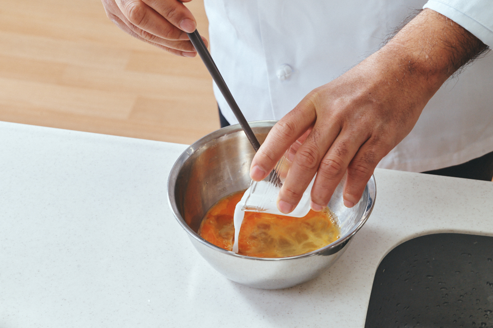 片栗粉は、必ず水で溶いておくのがポイント。そのまま入れるとダマになり、食感が悪くなってしまいます。また、卵液に加える直前ではなく、下ごしらえの最初に水溶き片栗粉を作っておきましょう。あらかじめ水を含ませておくことで、均一になじみやすくなります」