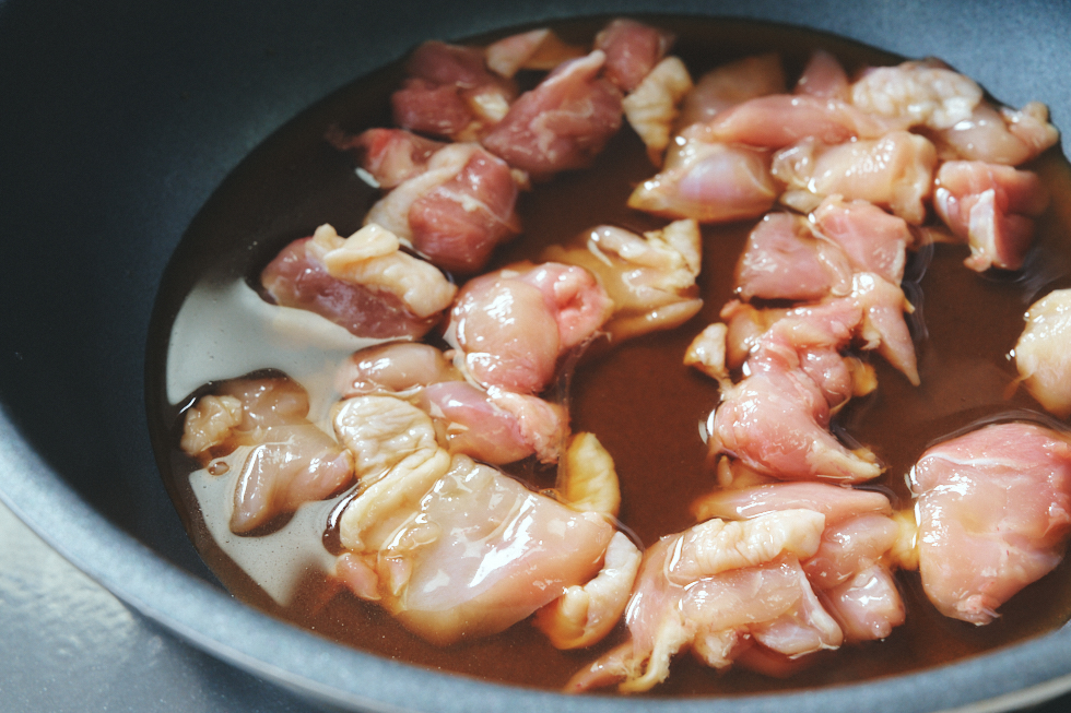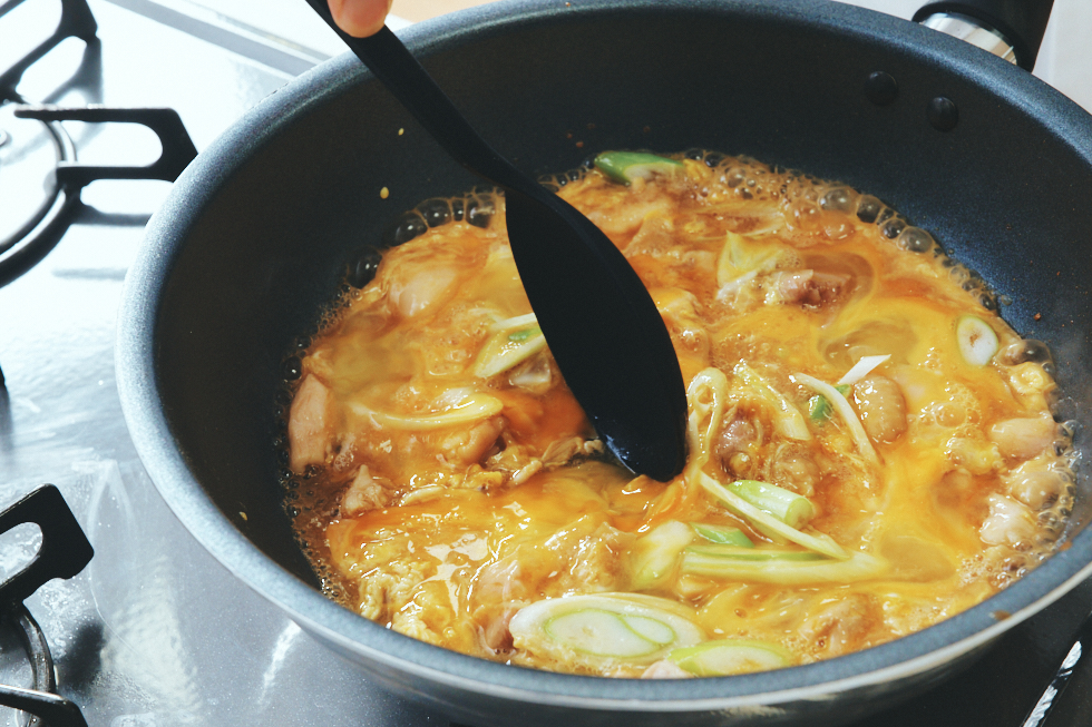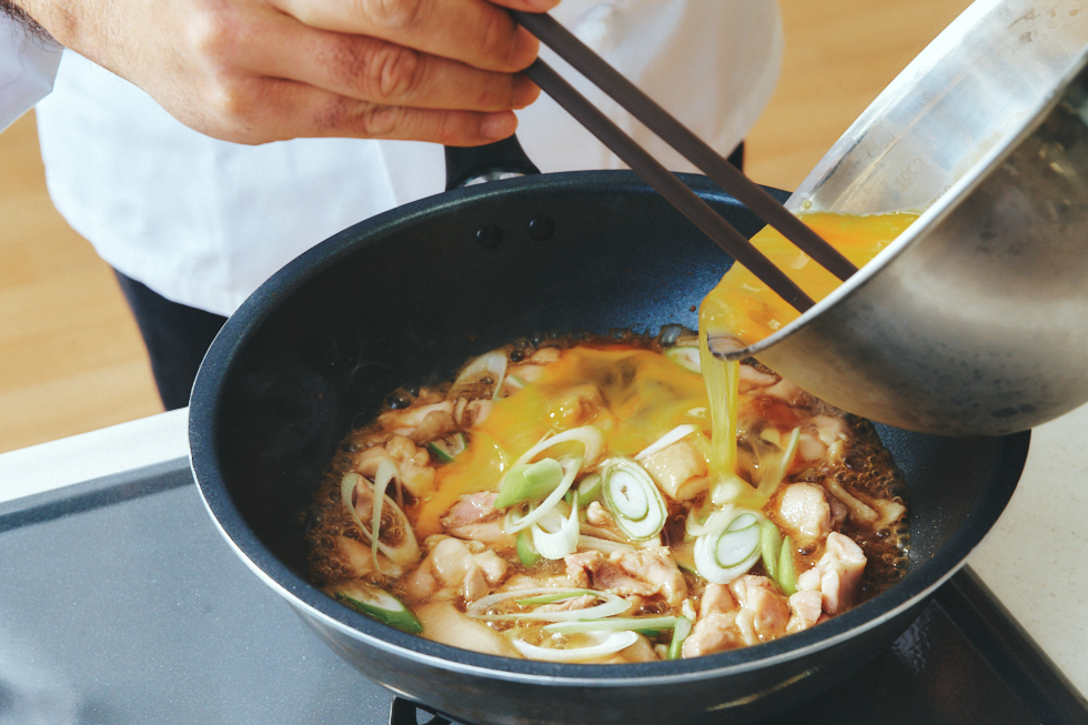 フライパンに、混ぜておいた煮汁と鶏肉を入れます。フライパンの大きさも、卵のふわふわ食感を作るためのポイントです。
