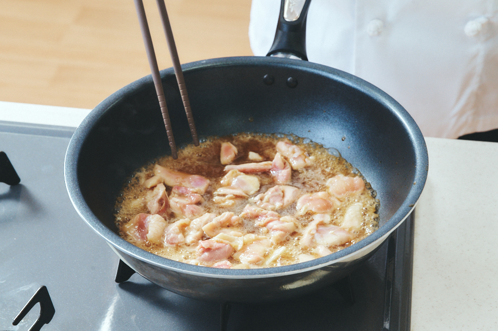 川﨑さん「大きいフライパンだと卵が薄く広がり、平べったい仕上がりになってしまいます。ほどよい卵の厚みを出すために、鶏肉の頭が液面から1/3程度出る大きさのフライパンを選びましょう」
