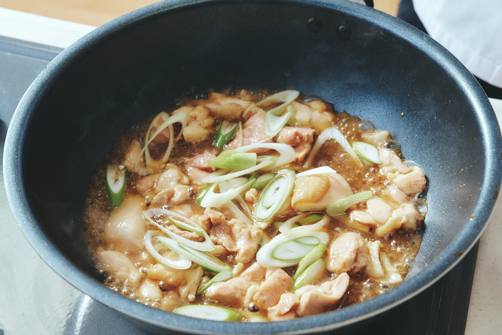 川﨑さん「煮立たせるのは、みりんに含まれるアルコールを飛ばすためです。ツンとした香りが抜け、甘みやうま味が引き立ちます。ただ、肉は加熱しすぎると水分が外に押し出され、パサつきの原因に。色が白く変わり、表面に火が通ったぐらいでねぎを加えてください」