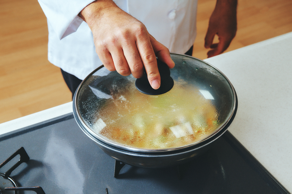 川﨑さん「フタをすることで、蒸気の熱が上からも加わります。上下から加熱することで火通りが均一になり、全体がふわっと仕上がります。白身が透明から白く変わったことを確認できたら火を止めてください。余熱でも火が通るので、表面にはまだとろみがある程度がオススメです」