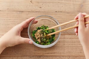 青菜は塩ゆでにし、冷水にとって冷まして水気をしぼり、みじん切りにする。「ほんだし」を加えて混ぜる。 -