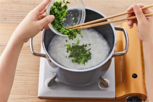 (1)のおかゆに(2)の青菜を加え、ひと煮立ちさせる。 -