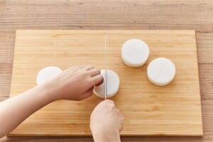 大根は2cm厚さの輪切りにし、片面に十字に切り込みを入れる。やわらかくなるまで30分ほどゆでる。 -