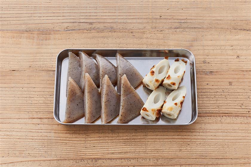こんにゃくは三角に切り、厚みを半分に切り、下ゆでする。ちくわは2等分し、斜め半分に切る。 -