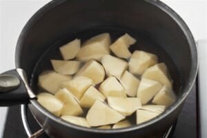 じゃがいもは皮をむいて4等分くらいに切る。鍋に入れ、ヒタヒタの水、