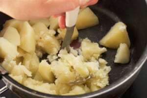 (1)のじゃがいもがやわらかくなったら湯を捨てて火にかけ、酢を加えて