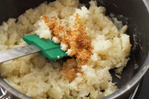 つぶしながら水気をとばす。(酢を加えることでマヨネーズがなじみやすくなります。) -