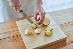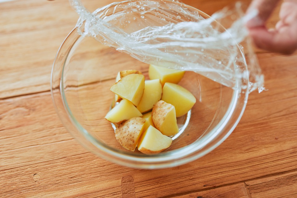 耐熱容器に(1)のじゃがいもを入れ、ふんわりとラップをかけて電子レンジ(600W)で5分ほど加熱する。 -