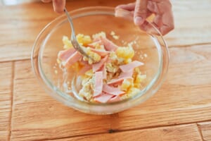 熱いうちにフォークなどで粗くつぶし、「コンソメ」を加えて混ぜる。粗熱が取れたら、「ピュアセレクト マヨネーズ」、(1)のハムを加えてあえる。
