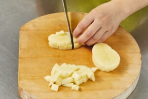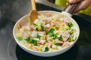 鍋に分量の水を入れて沸かし、「毎日カルシウム・ほんだし」半量、(1)のチンゲン菜の芯を加え、1~2分煮、(1)のチンゲン菜の葉・コーン、牛乳を加えてひと煮する。 -