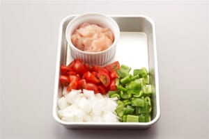 鶏肉、玉ねぎ、ピーマンは1cm角に切る。ミニトマトはヘタを取り、タテ4等分に切る。ボウルに卵を割り入れ、塩・こしょうをし混ぜ合わせる。 -