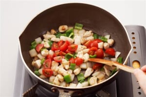 フライパンにバターを熱し、(1)の鶏肉・玉ねぎ・ピーマンを入れて炒める。肉の色が変わったら、(1)のミニトマトを加えつぶしながら炒める。 -