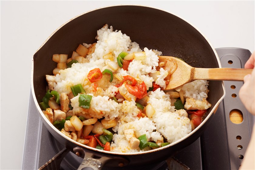 温かいご飯を加え、Aで調味して炒め合わせ、チキンライスを作り、一度取り出す。 -