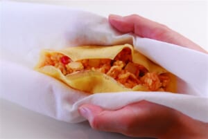 「ピュアセレクトマヨネーズ」半量をしぼり出し、手前からくるくると巻く。