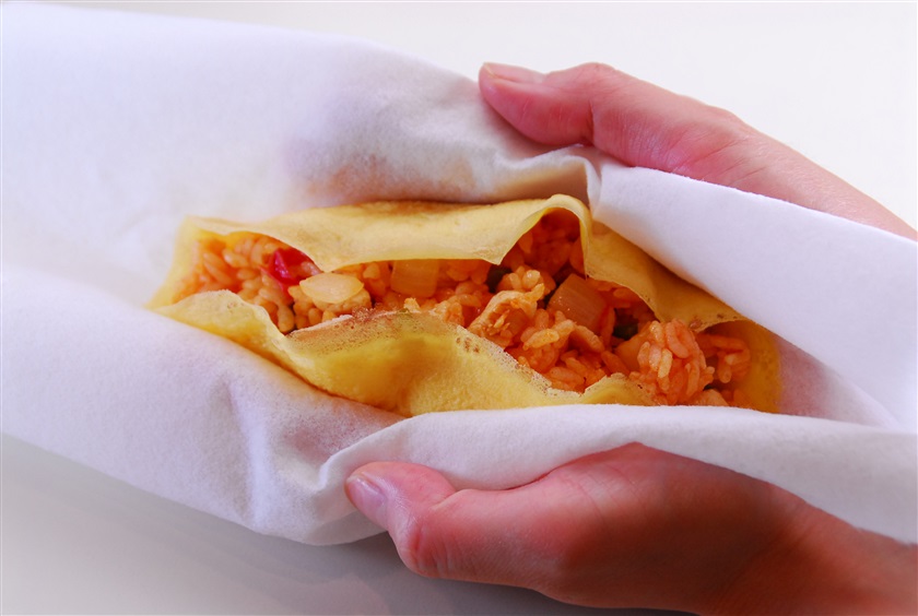 卵の上に(3)のチキンライスの半量をのせ、形を整えて包む。器に盛り、表面に十文字の切れ目を入れる。同様にもう1個作る。 -