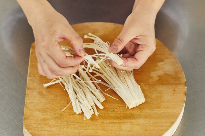 えのきだけは根元3cmくらいを切り落としてほぐし、玉ねぎは5mm幅の薄切りにする。 -