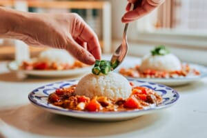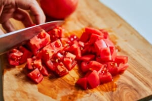 火を止め、カレールウを割り入れて溶かし、弱火で5分煮たら、残りの(1)のトマトを加えてひと煮立ちさせ、ご飯と一緒に皿に盛る。好みで小口切りにしたオクラをトッピングする。 -